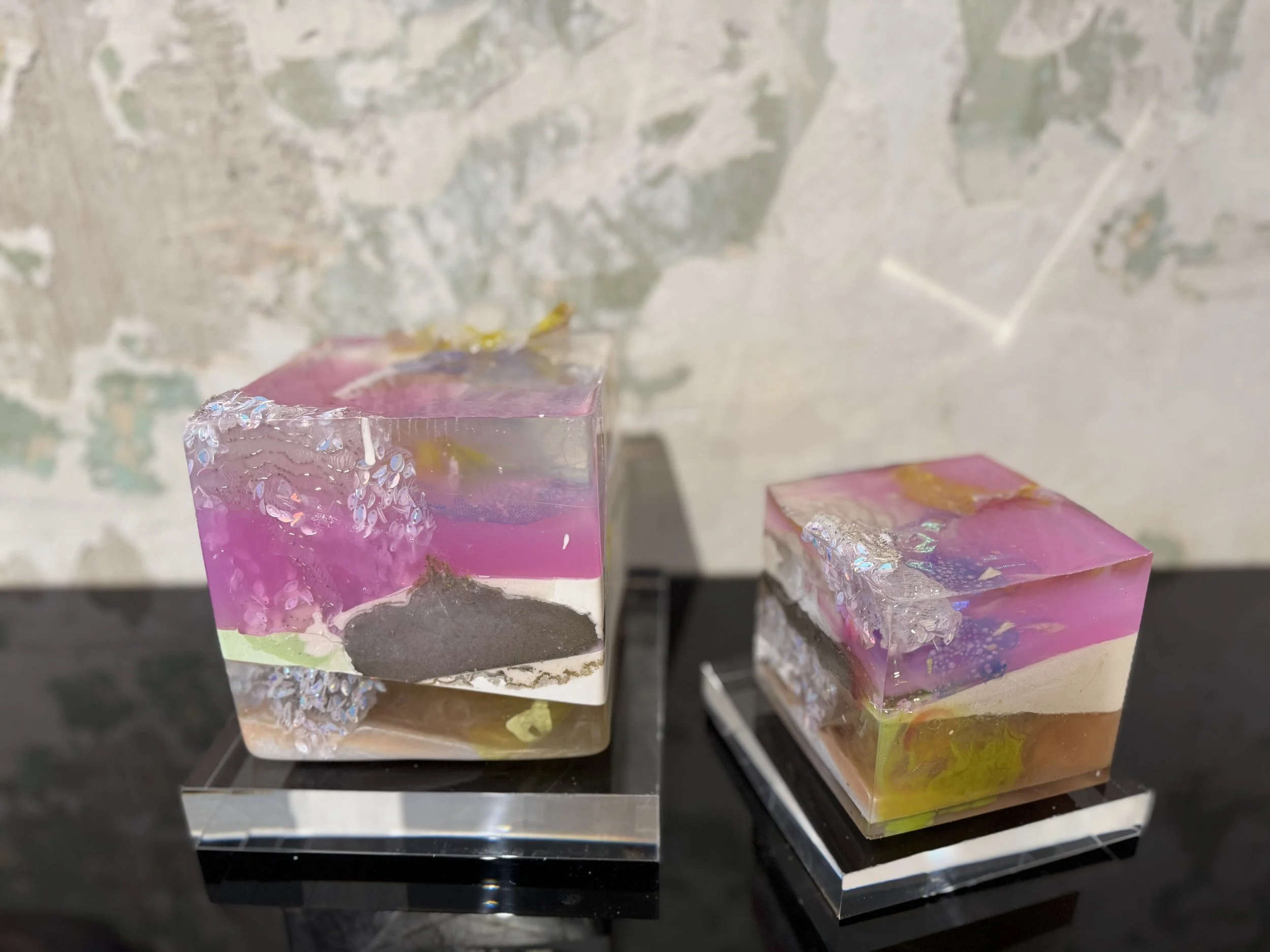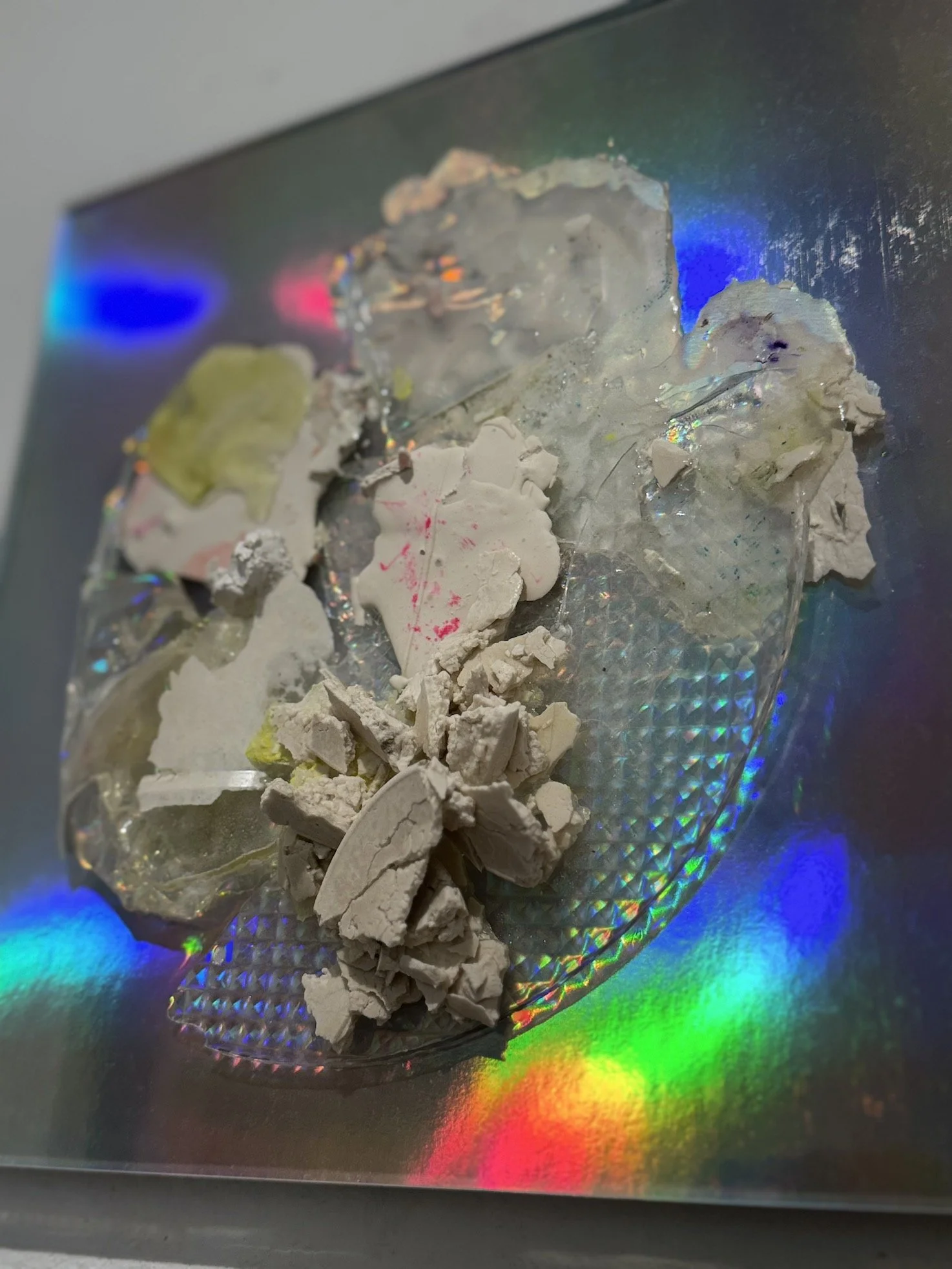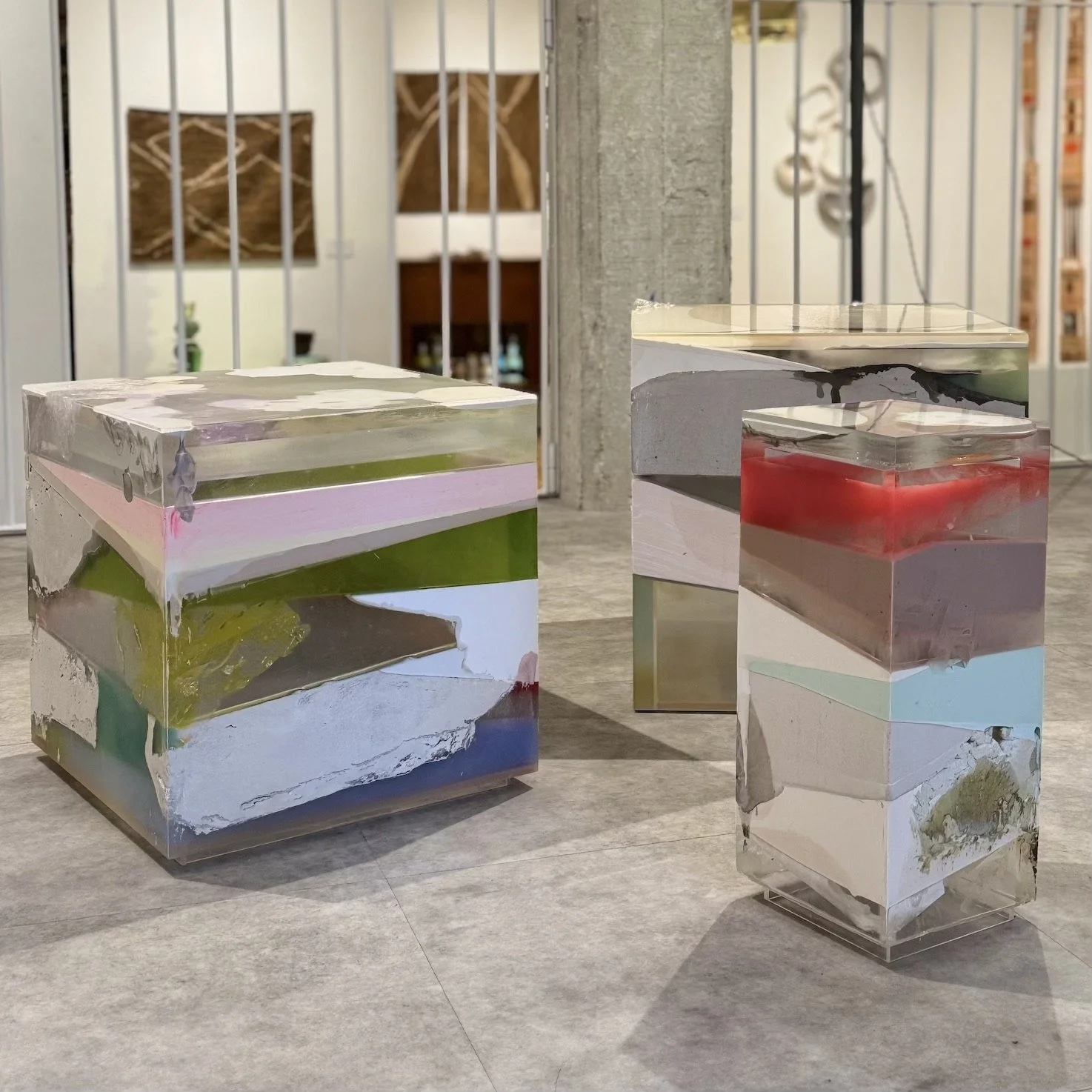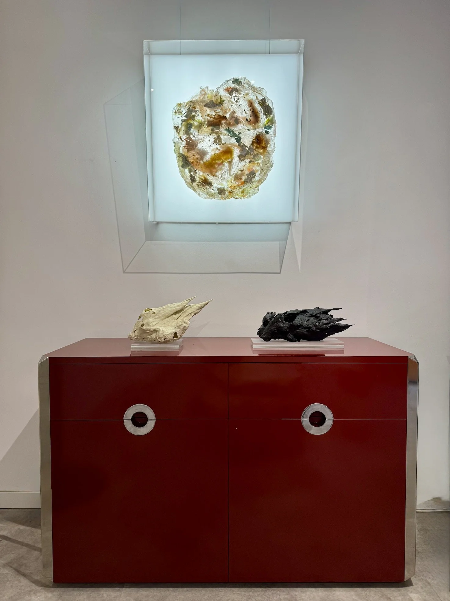 La artista explora cómo cada sustancia aporta su propia personalidad, generando paisajes internos, huellas geológicas o cuerpos híbridos. El color aparece también como elemento estructural, combinado con transparencias que dejan entrever lo que pasa bajo la superficie.